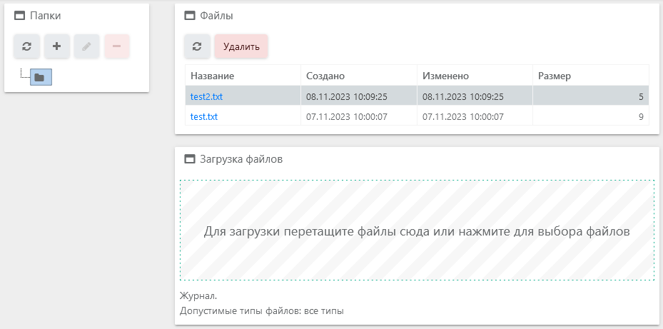 Файлы отображаются в блоке таблицей с указанием наименования, размера, даты создания и изменения.