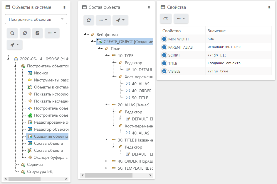Модуль Построитель объектов является основным интерфейсным модулем, который обеспечивает связь разработчика с ядром ПО "ЦЕНТР", хранящим библиотеку компонентов, и включает в себя следующие разделы: